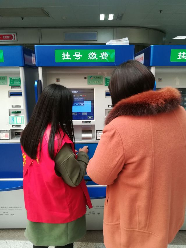 下午2:00,志愿者们在负责人的带领之下来到了徐州市四院。首先,医院工作人员向志愿者认真地讲述了工作内容和工作要求,并且详细地介绍了医院设备的使用方法。随后,志愿者们集结完成签到并领取了红马甲,经过简单的休整后便投入了工作。志愿者主要负责在一楼服务大厅帮助患者挂号及提取化验单,很多未使用过设备的人在志愿者的耐心帮助下,轻松解决了使用难题。在遇到一些疑难问题时,志愿者都会第一时间向医院工作人员寻求帮助。当看到一些家属因为担心病人而焦急不安时,志愿者也会上前宽慰他们,用一些朴实的话语让他们安心。下午5:00,活动圆满结束。