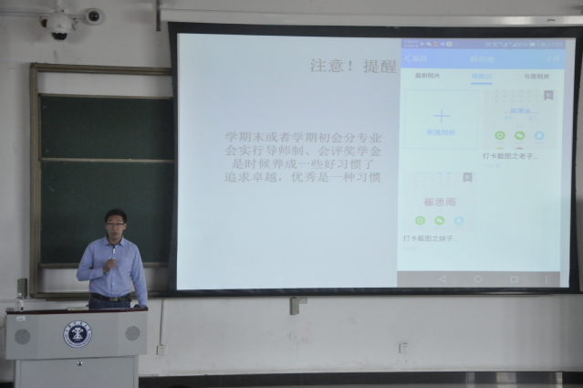 上午900,本次年级大会准时开始。会议伊始,李亮老师通过数据向大家展示了各班上学期的成绩,并结合上学期的成绩情况,从年级、班级和个人三个方面进行了学习情况的分析,对于表现良好的班级、个人给予了表扬,并期待大家在新的学期里能“百尺竿头,更进一步”。他强调,“合抱之木,生于毫末;九层之台,起于累土;千里之行,始于足下”,大一的基础学习是后续学习的基础,一定要把基础打牢。接着,他就宿舍卫生、宿舍关系、宿舍文化和晚熄灯相关情况进行了分析。对于表现优秀的卫生星级宿舍,他还精心地准备了一些小礼品进行了相应的奖励。随后,对于安全问题,他进行了着重强调,无论是宿舍安全、电信诈骗还是疾病预防问题,他列举了具体事例,希望引起大家的重视,保障好自身安全。同时对于补考、请假、缴纳保险、四六级报名、晚自习、早点名、从严请假等事宜,他也进行了安排和提醒。最后,李亮老师向大家介绍了新来的兼职辅导员腾毅老师,希望大家在今后的日子里能积极配合,共同为年级的建设出力。腾毅老师也现身说法,对大家进行了提醒和勉励,希望大家能追求卓越,将优秀做成一种习惯。上午1000,本次年级大会圆满结束。