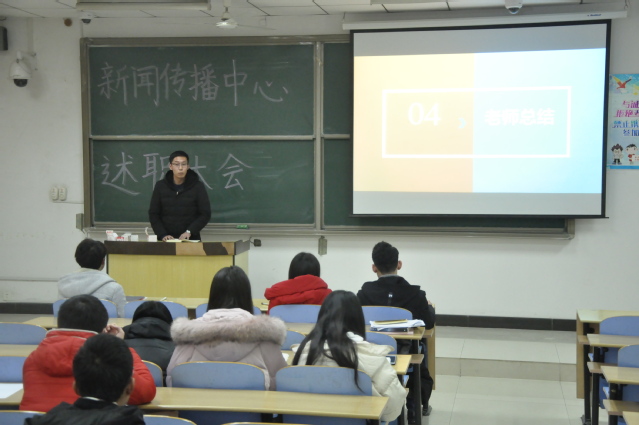 1月17日下午,学院大学生新闻传播中心2017-2018年述职大会在教4A101隆重举行。新传指导老师李亮老师和吴双老师出席了本次大会,新传全体成员参加了本次大会。新传主任王立鹏担任本次大会的主持人。