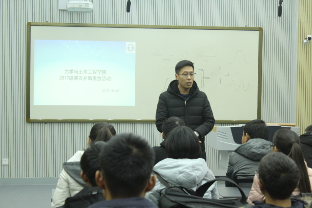 据悉,在本次寒衣发放活动前,土木学院相关工作人员已经提前统计好他们的尺码,喜欢的颜色和款式,确保他们能够穿的合身,穿的舒适。下午4:15,本次活动正式开始。首先李亮老师与大家进行了交流,他向大家询问了大学生活和学习上存在的问题,并结合自身经历做出耐心的解答,同时叮嘱同学们要安心学习,提高自身能力和综合素质。他还细心的询问大家最近的高数成绩,劝诫大家要努力学习高数,从心底认识到学习的重要性。随后他又对同学们进行了学校各类奖学金和其它资助政策的介绍,希望大家能够努力学习,争取获得奖学金,证明自己,同时不给大学留下遗憾。最后,李亮老师和张凯老师为同学们分发衣服。大家有秩序的排队上前领取,从老师手中接过温暖舒适的衣服,现场气氛温馨。