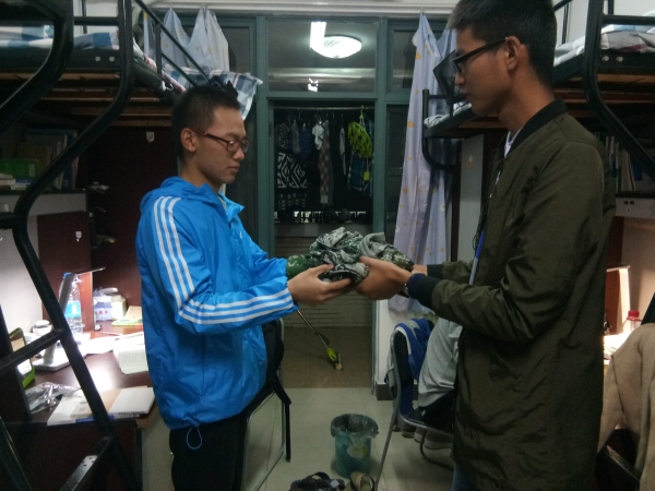 晚上8点,参与本次回收军训服活动的志愿者们于桃三宿舍楼下集合,活动负责人青协环建部部长杨涵,将志愿者们分成了两队行动,同时他还表示要让志愿者们在活动过程中要用最好的态度来对待同学。在小组分队长的领导下,志愿者们分别去了桃三的三楼与七楼回收军训服。志愿者们来到同学宿舍,在礼貌的敲门之后,志愿者们耐心地解释了此次前来的目的,询问同学是否能有闲置的军训服,并希望他们能够将军训服捐赠出来,在此次活动中,同学们也十分的热心,纷纷将自己的军训服拿出来,表示要将自己的军训服捐献出来,有的同学还将放物品的袋子贡献出来,为志愿者们放军训服提供方便。晚上9点半,活动顺利结束。