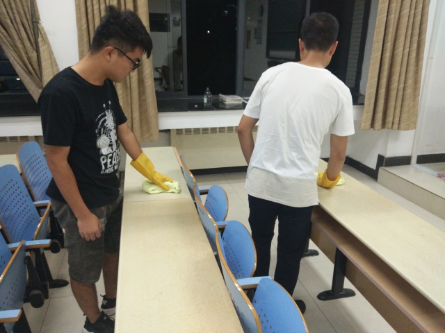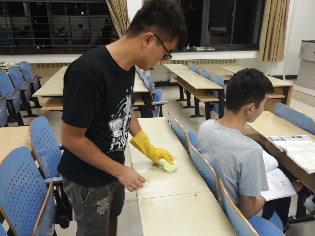 9月8日晚7点,学院5.12青年志愿者协会于博学1号楼进行课桌清扫活动。