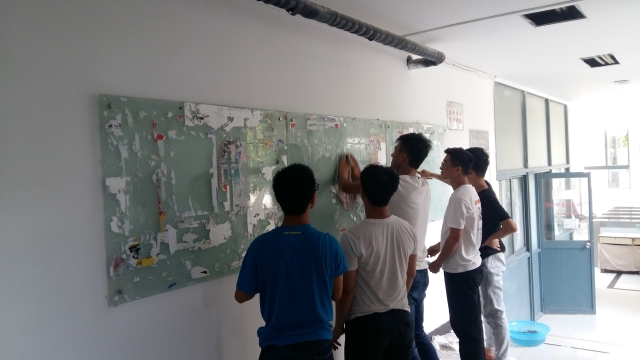 经过一整个暑期,桃三的广告牌由于长期无人管理,已经充斥了各种杂乱的小广告,严重影响了桃三宿舍楼的整体清洁状况。为了给即将到来的17级新生营造出一个良好的宿舍生活环境,学院青年志愿者协会特地组织了志愿者对桃三宿舍楼里的广告牌进行清理。宿舍楼内每一个角落里的广告牌,志愿者们都一一前去清理。这些广告因为长期无人管理,原本用于粘贴的粘胶已经紧紧地贴在了广告牌的玻璃板上,给志愿者的清理工作带来了很大的困难。尽管如此,前去清理的志愿者们还是破除万难,用清水和铲子等工具一点一点地对广告牌进行清理。虽然清理过程十分缓慢,但效果却很显著。三个小时后,地上留下了一片纸屑和粘胶的残余物,而原本杂乱不堪的广告牌也变得焕然一新。