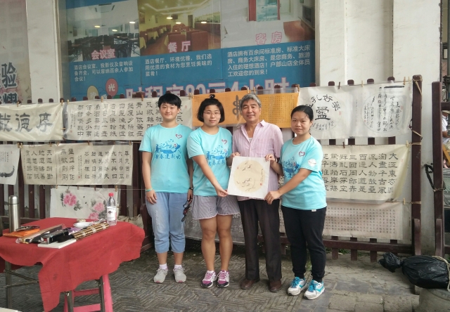8月28日下午14:00点,服务团的成员们到达户部山,对一位老艺术家陈良勇先生进行采访。首先,陈先生热情洋溢地给服务团的成员们介绍他的作品。其次,陈先生为我们讲解了一些书法的书写结构搭配及书法间的融会贯通。提出了练字要用批判性的思想去练字,学会举一反三,触类旁通,还要做到取其精华,去其糟粕,自己的字体中一定要有自己思想。除此之外陈先生还给成员们介绍了一种在中国几近失传的书体“白舟篆”,以及这种字体的特点和文化渊源。最后,陈良勇先生为本服务团的成员们当场作画一幅《乐在其中》,在作画中进行细节讲解,让服务团的成员们切身感受到国画的魅力。今天的服务活动陈先生不仅给服务团的成员们畅谈了练习书法的用处,而且讲述了他一生经历中书法给他带来的机遇以及书法对人的心境、生活以及精神气的影响。服务团于下午16:00结束了本次文化服务活动,返校后服务团的成员们对今天的服务活动进行了讨论与总结。