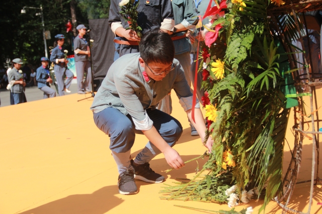 接着,实践团成员参与了在红军烈士陵园举行的贵州专项实践活动的出征仪式。团省委副书记闵江涛、遵义市人大常委会副主任刘志义、遵义市人民政府副市长李莲娜、遵义市政协副主席何琼出席出征仪式。实践团成员在认真听取讲话精神后,秉着闵江涛团省委副书记提出的三点希望——“积极了解历史,坚定理想信念;认真实践锻炼, 磨练坚强意志和增长才干本领,努力奉献社会”,前去给在红军长征中牺牲的先烈献花,以表达自己对革命先烈的敬佩敬仰之情和坚决继承和发扬革命精神的决心。