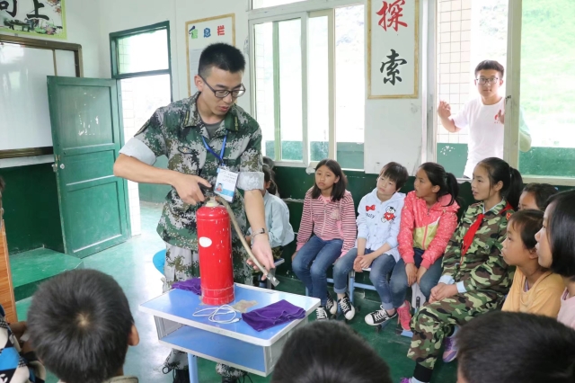 7月16日上午十时,学院筑梦公益暑期支教团一分队对学生进行国防教育活动。一分队黄霍明老师对学生进行军人队列动作、消防知识、防震减灾方面知识的培训。