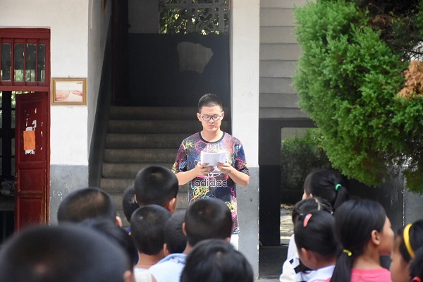 上午9点50分,全体人员集合完毕。10点整,升旗仪式准时开始,三分队队员路正一、王之凡作为升旗手迈着铿锵有力的步伐登上了升旗台,伴随着雄壮的国歌声,国旗徐徐升起,全体人员肃然起敬,面向国旗行注目礼。接着,“筑梦”公益第三分队分队长王建军作为支教队员代表进行致辞,他不仅对乡镇府领导以及学校工作人员的支持表达了感谢,还强调本次支教活动的意义不仅是向学生们普及科学文化知识,更是要促进龙盘村的同学们实现多方位多领域的全面发展。随后,“筑梦”公益三分队特针对升旗仪式举行红领巾佩戴环节,各班学生代表有序出列,队员张祎、赵潇艺、李国庆、付尚万、王浩以及隽亚明为他们佩戴红领巾。最后,队员包家欣作为领誓人带领全体师生进行国旗下的宣誓。