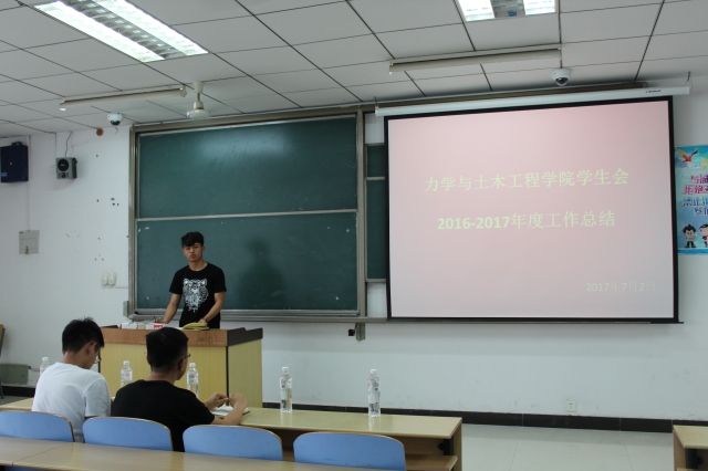 下午两点,本次会议正式开始。首先由学生会主席陈星宇面向全体学生骨干进行了学院学生会2016-2017年度工作总结,介绍了学院2016-2017年度学生会各项工作的整体情况,同时对这一年来工作中的优点与不足进行了总结和评价,并与学生会未来的干部们分享了宝贵的工作经验。接着,学生会各部门部长也针对自己部门一年的工作进行了全面细致的总结,为之后部门工作的运行奠定了坚实的基础。