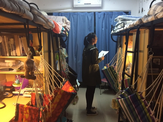 晚上10点,本次宿舍卫生检查工作正式开始。生活部干事和各班生活委员进入宿舍仔细检查各个宿舍的卫生状况。据悉,本次宿舍卫生检查中检查的项目共有九项,其中包括对宿舍地面、宿舍桌面以及阳台卫生的考察,卫生情况满分为十分。生活委员和生活部干事各自负责不同的楼层,对各个宿舍进行认真细致的检查。检查结束后,生活委员将表交给对应的生活部干事,由干事们进行这一周的数据统计,以此作为生活委员和班级考核依据的一部分。检查人员在做好自己的本职工作的同时,还不忘提醒同学们要注意宿舍安全,为自己营造一个良好安全的宿舍环境。在此次检查中,检查人员发现,绝大部分学生能遵守学校宿舍管理规定,大部分宿舍整体卫生状况良好,环境较佳,被褥衣物摆放整齐,地面、桌面整洁干净,用电合理,没有违规使用大功率电器现象。
