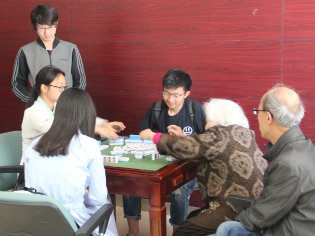 志愿者们与老人打麻将消遣