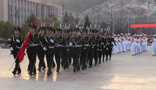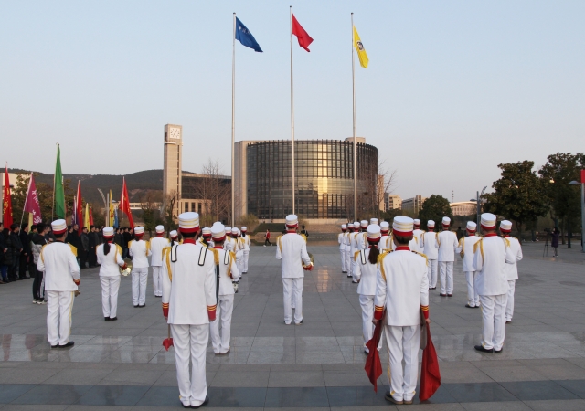 启动仪式的第一项是升国旗校旗仪式。七时许,在大学生管乐团吹奏的激情豪迈的旋律声中,国旗护卫队昂首挺胸,飒爽英姿,护卫着国旗迈着矫健的步伐进入升旗区。在激昂嘹亮的国歌声中,全体师生满怀深情,注视着五星红旗徐徐升起。国歌毕,伴着管乐团奏庄严浑厚的《52av