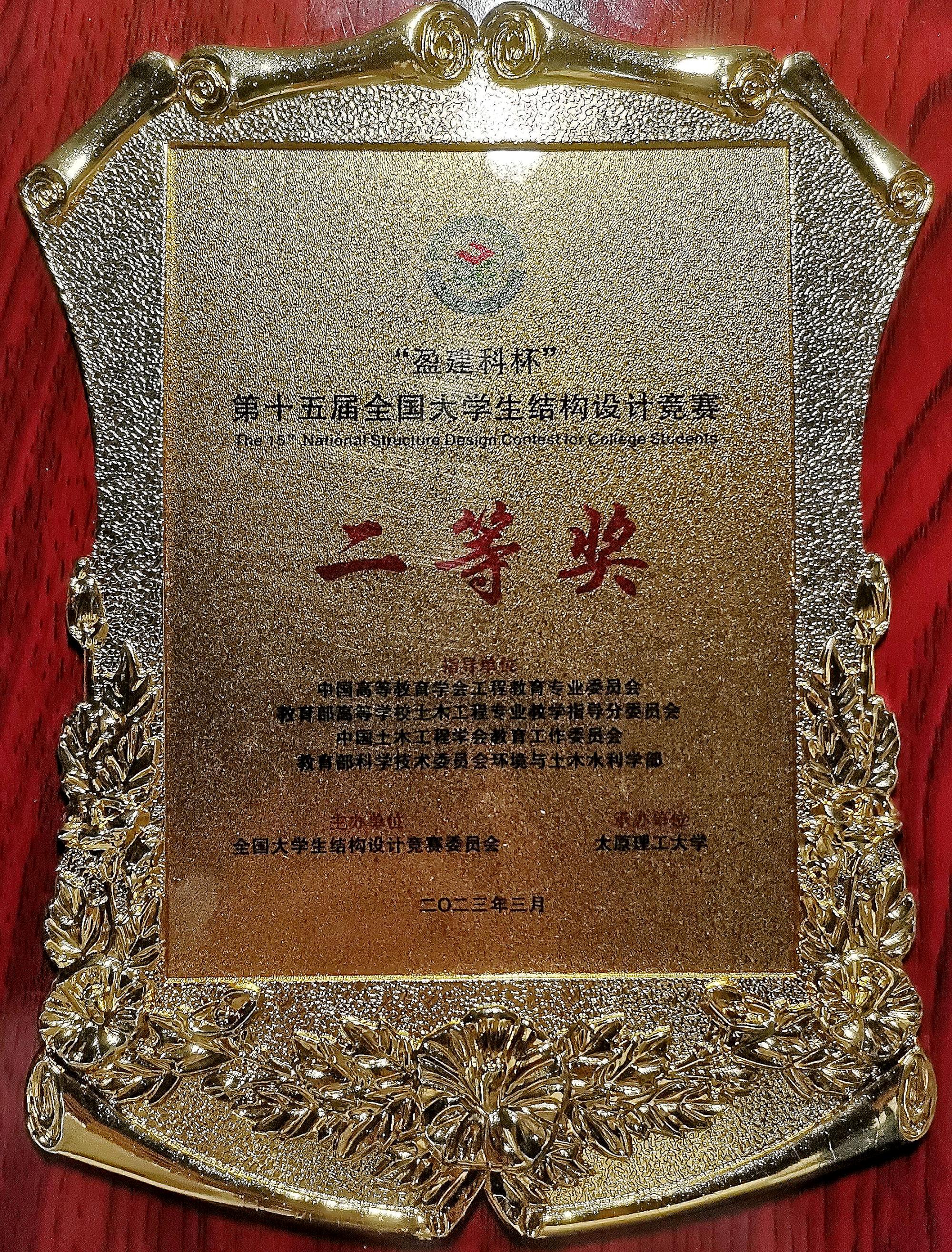 2023年3月22日至26日,“盈建科杯”第十五届全国大学生结构设计竞赛在太原理工大学举办。学院由张营营教授、范力副教授、杜健民副教授、李贤教授、贾福萍教授等老师指导,2020级本科生李文磊、盛珺瑶、蔡杰等同学组成的参赛队伍与来自全国110所院校的111支团队同台竞技,最终荣获全国二等奖的好成绩。