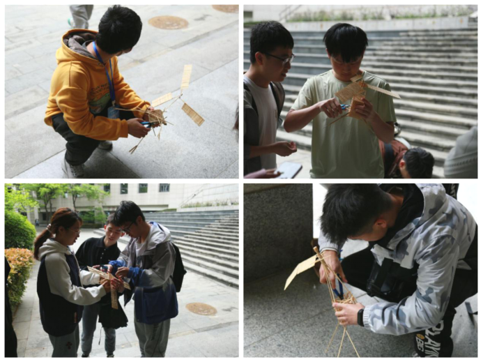 4月14日,来自之前初赛晋级的学生带着自己修复或是再加工的结构,来到图书馆钟楼顶层处,进行决赛的放飞。天空虽微微飘雨、3习习凉风,依旧降低不了同学们的热情和紧张的心情。最终,“神话”等3个组获得一等奖,“小小奇趣蛋”等7个组获得二等奖,“三世同堂”等10个组获得三等奖。