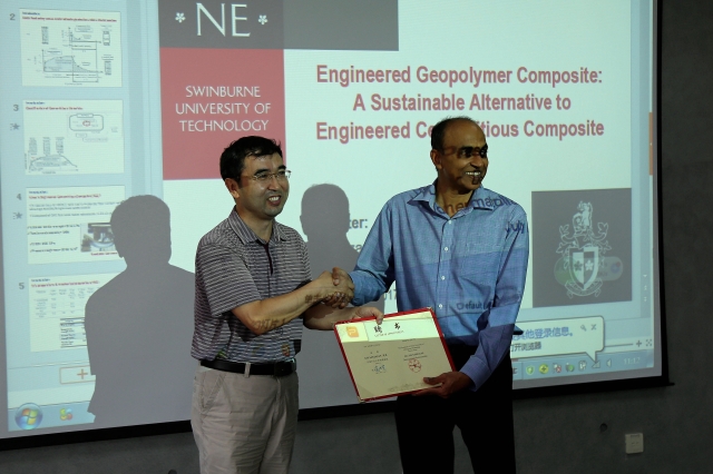 来自澳大利亚斯威本科技大学的Jay Sanjayan教授、博士后Behzad Nematollahi,莫纳什大学的Jayantha Kodikara教授、张春顺研究员,深部岩土力学与地下工程国家重点实验室商翔宇副教授、土木学院姬永生教授分别以“3D Printing using Concrete for Construction Purposes”、“Engineered Geopolymer Composites”、“Modelling of compacted soil using a novel framework”、“Continuum breakage mechanics: physical roots and applications”、“Stress-dependent mechanical behavior of clayey soil”、“粉煤灰地聚合物的制备技术及资源化应用研究”作了特邀报告。与会学者就专家特邀报告和关心的学术问题进行了深入讨论。