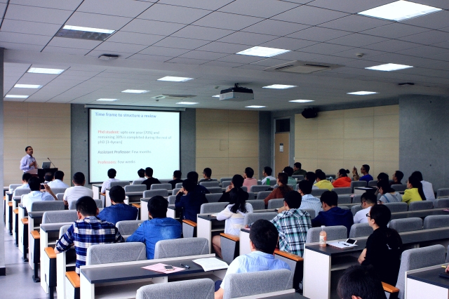 王建国教授,均围绕如何撰写高水平研究论文,分别做了题为《How to write the literature review》、《科技论文写作与投稿》和《SCI 论文的写作经验与体会》的学术报告。Ranjith教授结合自己十余年指导博士生撰写文献综述的经验,主要给大家阐述了何时开始写文献综述、为什么要写文献综述、如何写文献综述以及撰写综述时需要注意的细节等;刘建军教授结合他自己多年来作为学报主编的经历,主要从为什么要写论文、如何做科学研究、学术论文怎么写、论文的投稿流程、学术不端的预防5个方面进行了详细介绍;王建国教授从为什么要写SCI论文、什么是SCI论文、如何写SCI论文、SCI论文投稿程序及对策、如何准备初稿等方面,分享了SCI论文写作经验与体会,他强调SCI论文的灵魂是创新,是新知识的记载和传播;SCI论文写作就是进行组织实验事实、科学假定和理论之间的逻辑关系,充分展现背后的新原理,新知识或新技术。