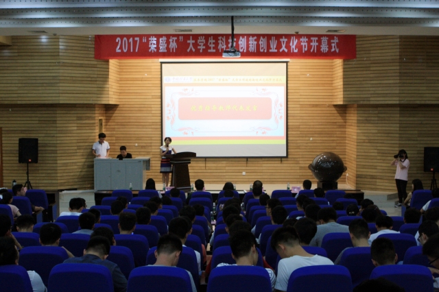 本网讯:6月14日下午,学院2017“荣盛杯”大学生科技创新创业文化节开幕式在学院楼A108报告厅举行。学院院长叶继红、院党委副书记张庆春、行政副院长王琪,荣盛(徐州)房地产开发有限公司投资拓展副总乔占江、人力资源经理姜雪娇以及学院大学生课外科技创新活动领导小组的各位委员老师、各系所和办公室教师代表、全体专兼职辅导员老师和学生代表共同出席和参加开幕式。开幕式由学院大学生创新协会指导老师游洋主持。