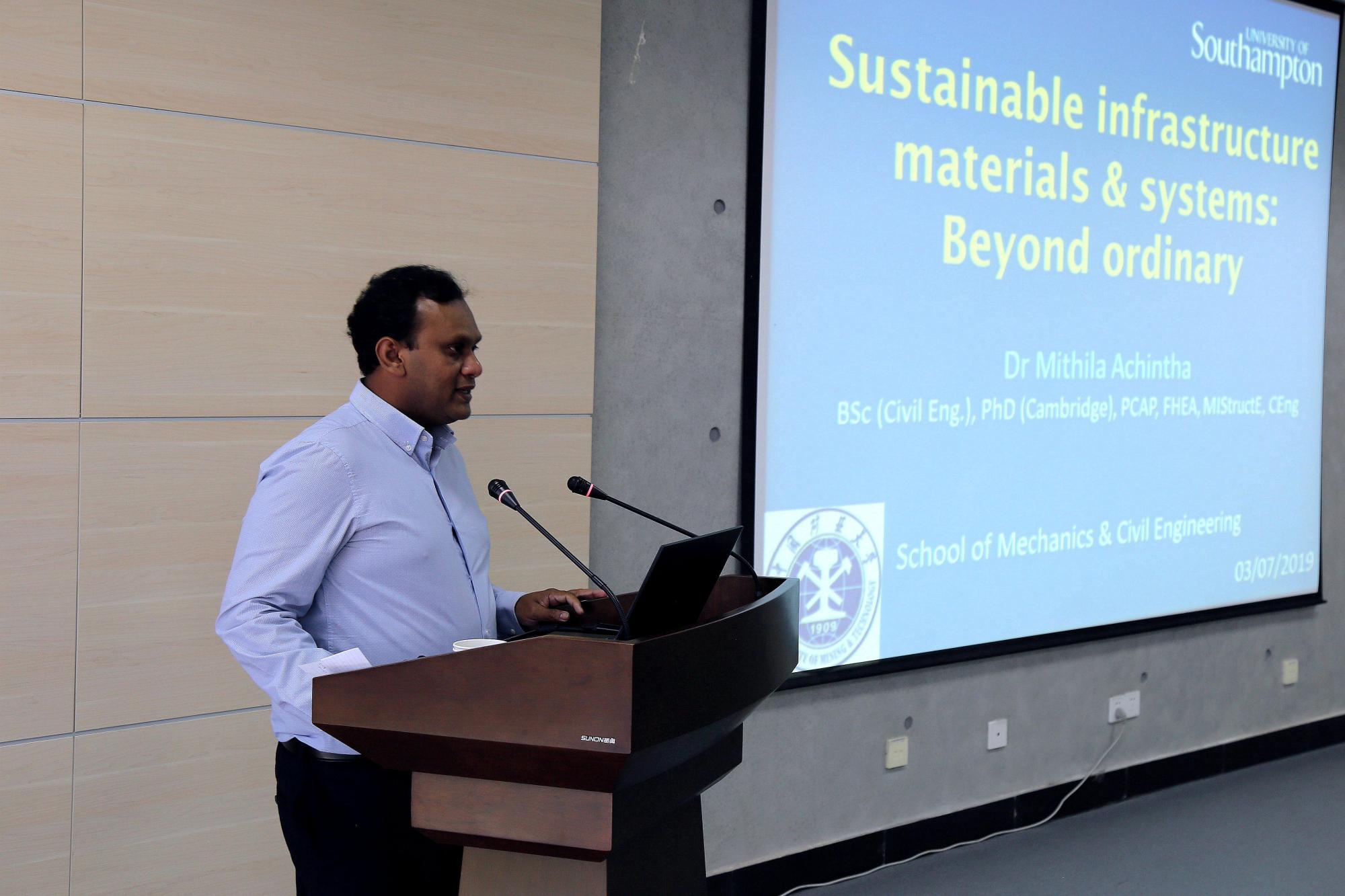 邀请,2019年7月3日上午,英国南安普顿大学Mithika Achintha博士来校进行学术交流,在深部岩土力学与地下工程国家重点实验室305报告厅作了题为“可持续基础设施材料及其系统研究:超越传统”的学术报告。院长叶继红教授等师生参加了本次学术报告,学术报告会由副院长杨圣奇教授主持。