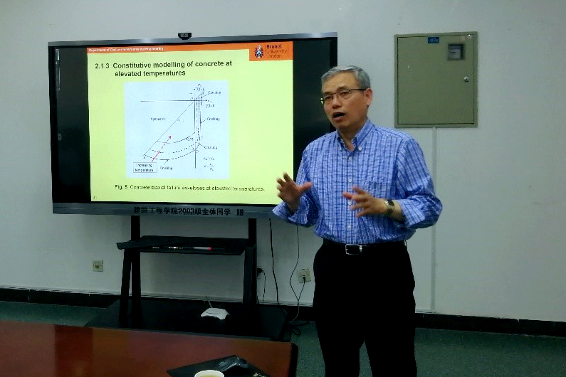 开展学术交流。访问期间,黄昭辉教授在学院A220室举办了两次学术报告,报告题目分别为“An extended finite element model for modelling localised fracture of reinforced concrete beams in fire”和“A robust static-dynamic procedure for modelling the progressive collapse of steel structures in fire”。两次报告主要介绍了扩展有限元计算模型、混凝土裂缝单元模型、结构倒塌计算方法和高温粘结滑移模型等,并将上述模型应用于火灾下混凝土梁变形行为和裂缝模拟及结构倒塌机理分析。在座师生与黄教授就各种构件火灾行为、扩展有限元和裂缝数值模拟问题进行深入热烈的交流与讨论。报告会由袁广林教授主持。