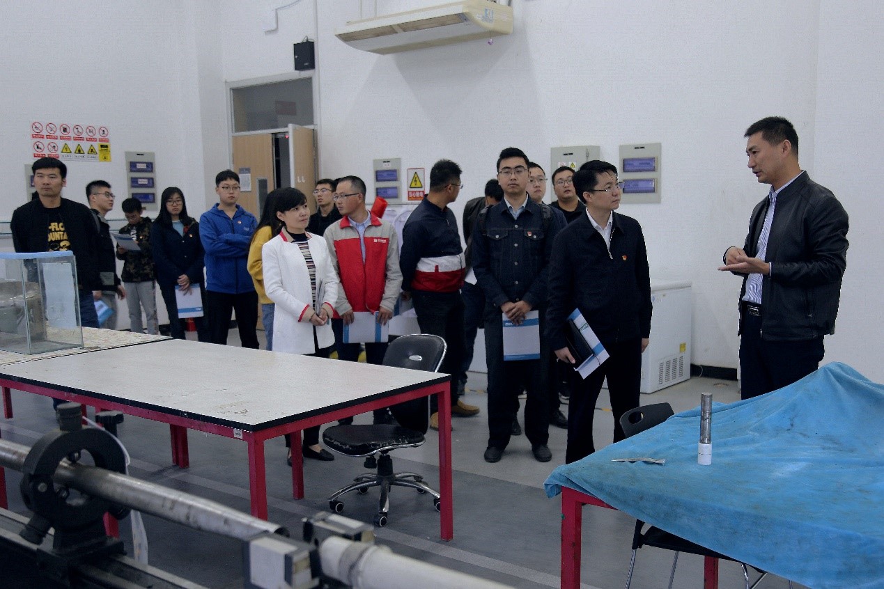 共建交流会议前,中建国际投资(江苏)有限公司来访的10名党员在学院学生党建指导老师刘晴的陪同下,在深部岩土力学与地下工程国家重点实验办公室主任赵春晓老师的讲解下参观了实验室。