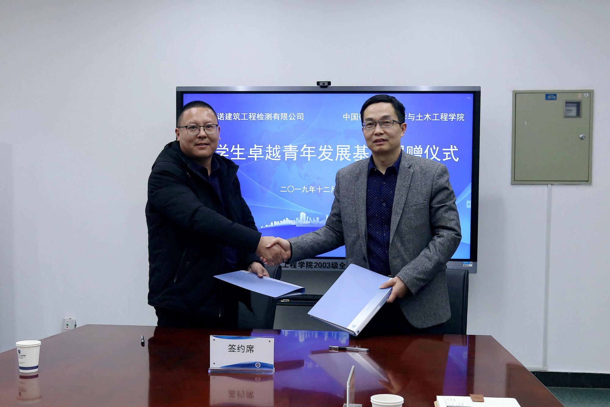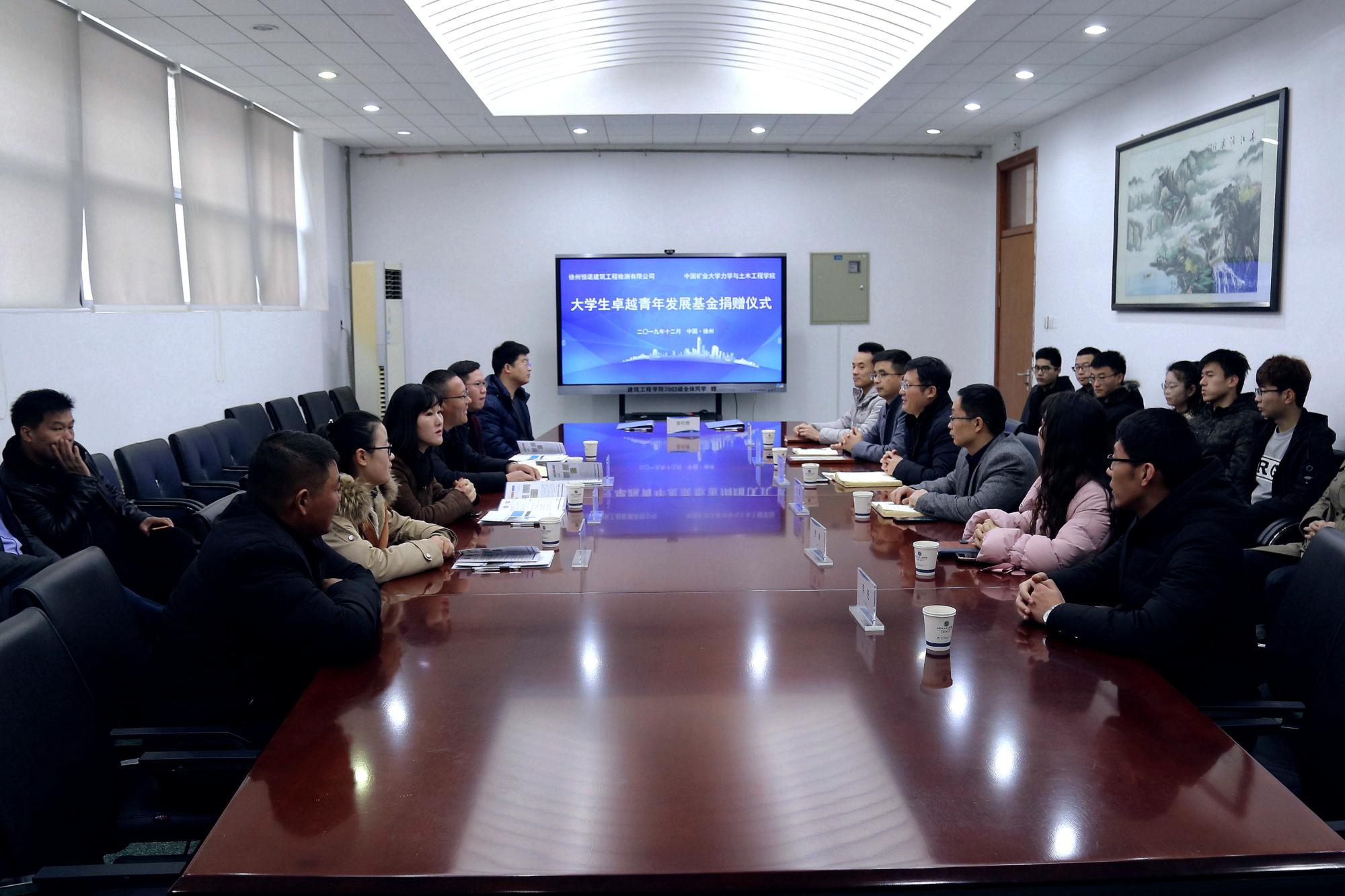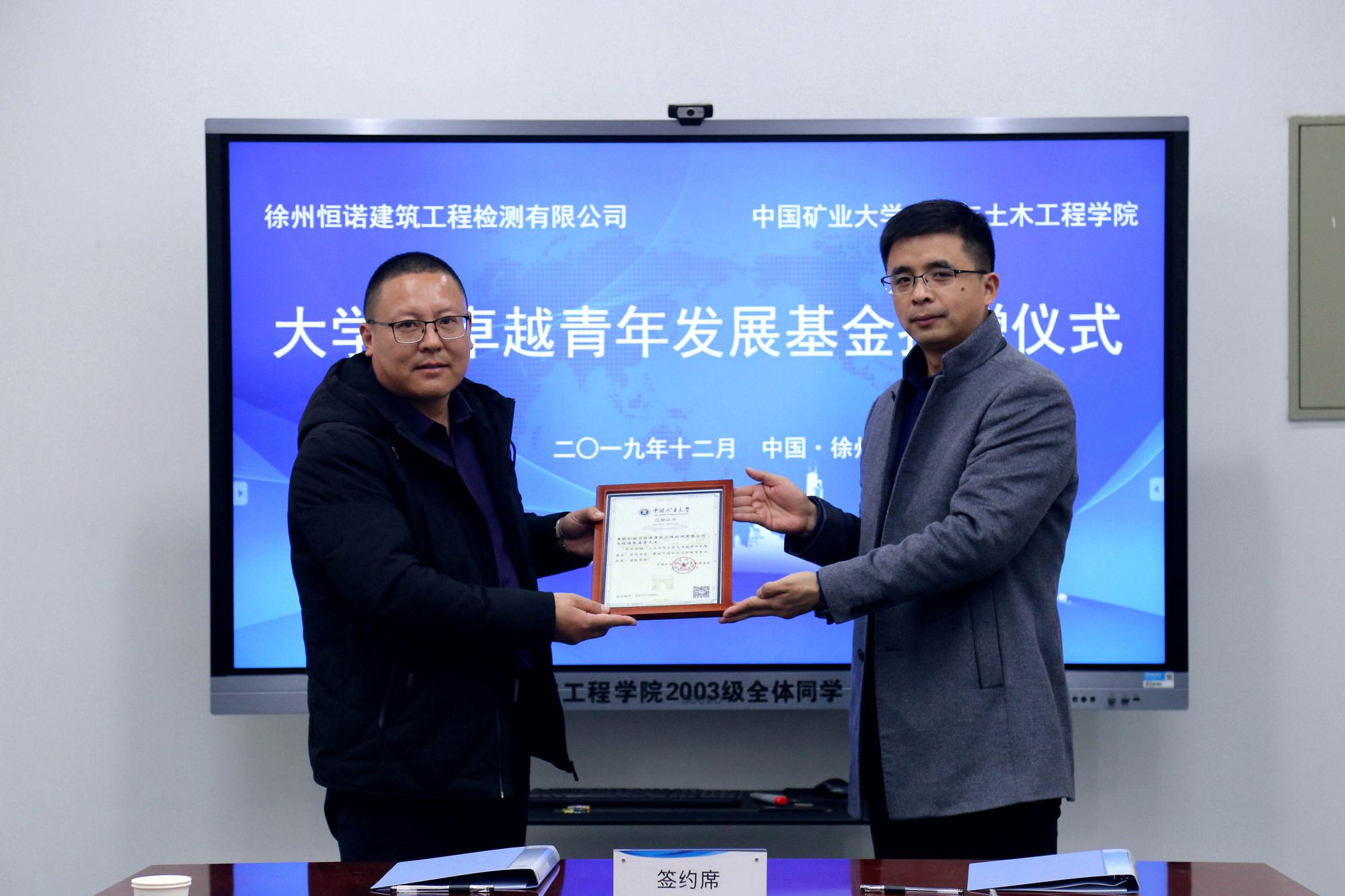 12月6日上午,学院在A220会议室举行大学生卓越青年发展基金捐赠仪式。学院党委副书记张庆春、副院长王琪,徐州恒诺建筑工程检测有限公司总经理张磊堂,校教育发展基金会办公室主任王文龙、总务部工程项目管理办公室主任宋亚林出席了捐赠仪式,捐赠单位代表、校发展基金会项目主管以及学院部分师生代表参加了捐赠仪式。