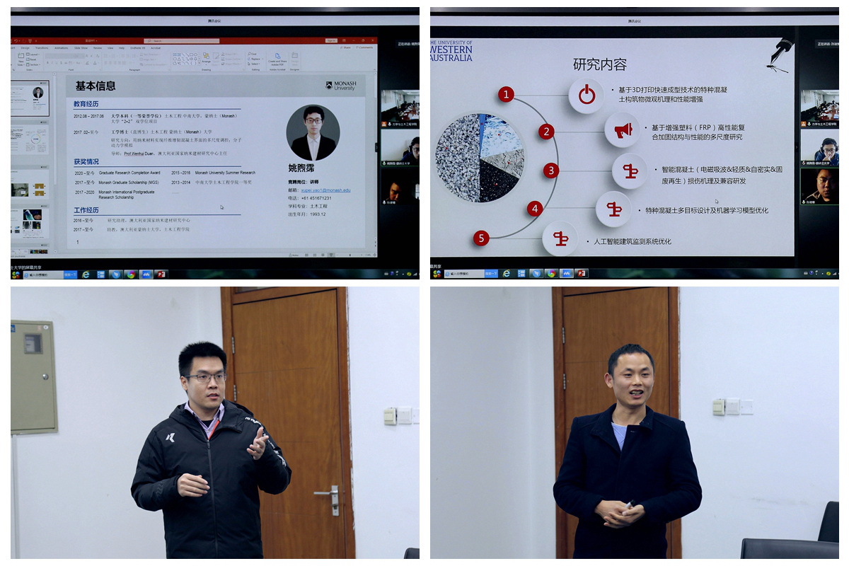 。与会青年学者围绕各自的学科前沿研究成果进行了分享报告。参会学者与院领导、教授会成员、系所负责人就人工智能、3D打印、健康监测、材料力学、多孔介质物理力学、土木工程材料多尺度物理力学、颗粒材料微结构与宏观性能的关联机制研究、纳米材料对纤维增韧混凝土界面的改性等学术问题,以及市情、校情、院情等人才引进政策,学院的科研发展平台,提供的生活条件保障等进行了充分的交流和讨论。