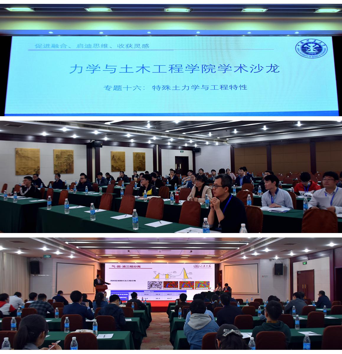 骆汀汀副教授、莫品强副研究员、李瑞林助理研究员、高柳老师、褚召祥老师和深圳大学刘一飞老师分别作了题为“相界交面对非饱和颗粒状土强度的影响的宏细观研究”、“砂土组构演化机理及各向异性本构模型”、“水平冻结过程中粉土基质吸力特征研究”、“气态水迁移诱发非饱和粗粒土冻胀的试验研究”、“冻土非线性热参数测定方法研究”、“含天然气水合物粉土宏观力学特性研究”、“基于小孔扩张理论的静力触探贯入机理研究”、“月球开发与月壤力学”、“基于物质点法的桩基打入过程机理分析”、“进化视角下砂土热导率-影响因素关联式及其演化机制”、“复杂不规则颗粒的形态表征体系及数值重构算法”的学术报告。