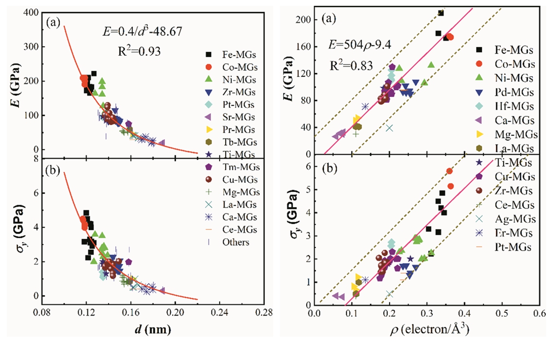 研究人员从金属玻璃独特的原子排布特征出发,将其无序结构近似为金属双原子之间的相互作用、基于双体势函数和费米球-布里渊区的相互关系建立了理论模型,得到了金属玻璃屈服强度σy、杨氏模量E与金属玻璃平均原子半径d及价电子态密度ρ之间的关系,如下图所示。该研究结果得到了同行评审专家的充分肯定(“The present work is of interest to the field of MGs and has important implications for understanding structure-property relationships in disordered systems”)。