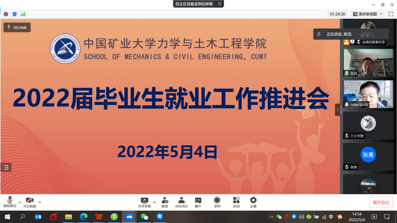 为贯彻落实好国家、江苏省关于2022届毕业生就业工作相关会议和学校近期关于就业工作的会议精神,分析研判学院2022届毕业生就业工作形势,全力做好“稳就业”、“保就业”工作,切实推进学院毕业生实现充分就业和高质量就业,5月4日下午,学院通过线上开展2022届毕业生就业工作推进会。党政领导、各系所主任、党支部书记、研究生毕业生导师、本科生毕业班班主任、毕业年级辅导员参加了会议,会议由马占国院长主持。
