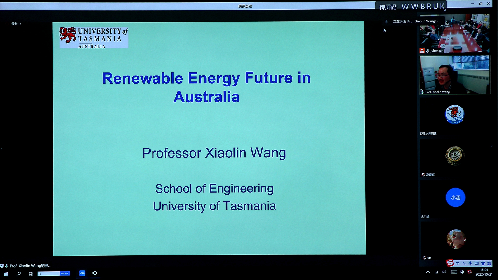 本次报告会特邀澳大利亚塔西马尼亚大学王小林教授作了题为《Renewable Energy Future in Australia》的学术报告。他首先介绍了澳大利亚以及塔西马尼亚大学的基本情况,然后总结了目前世界上能源利用和温室气体排放的一些现状,以及采取不同温室气体排放政策所产生的可能性后果,并着重介绍了澳大利亚在巴黎协定中的承诺以及目前的能源开发方向和政策,最后分析了澳大利亚可再生能源利用所面临的挑战和实现100%新能源发电的可能性。