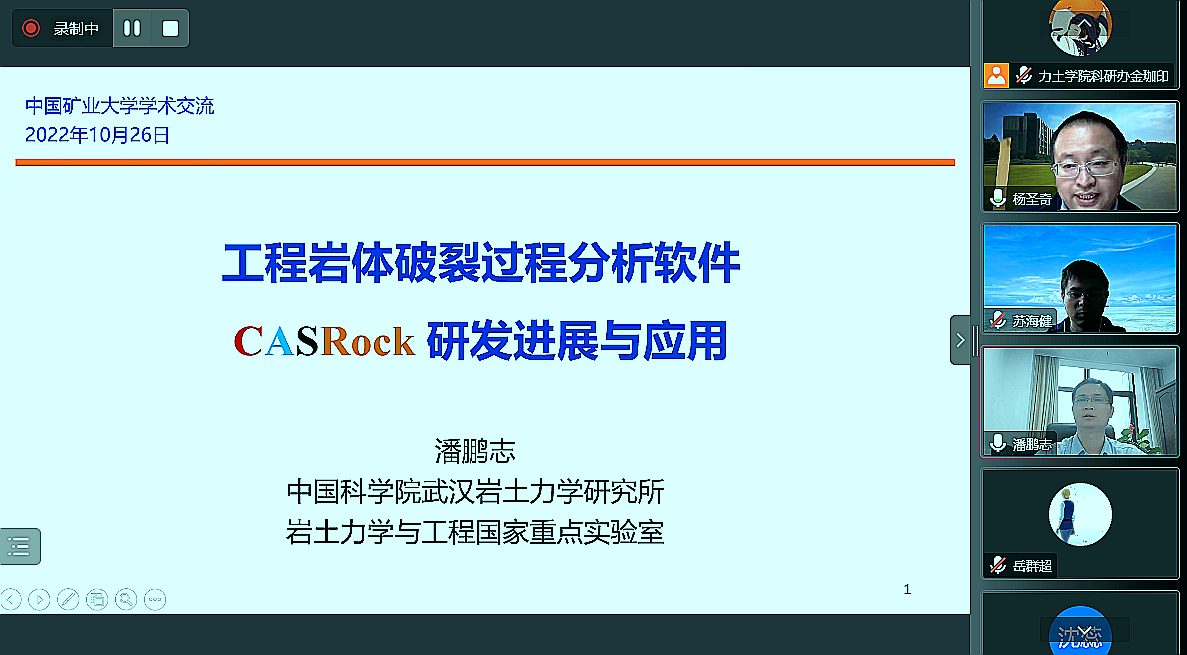 本次会议特邀国家自然科学基金杰出青年基金获得者、中国科学院武汉岩土力学研究所潘鹏志研究员前来交流讨论,做了《工程岩体破裂过程分析软件CASRock研发进展与应用》的学术报告。潘鹏志研究员指出,国内自主研发软件方兴未艾,岩土工程数值分析软件大部分来自国外,自主软件的缺失存在产业安全风险,基于复杂条件下工程岩体破裂过程分析的重大需求,数值分析方法的创新与软件的自主研发成为国家重大战略之一。潘鹏志研究员结合工程岩体破裂的典型特征,阐述了局部化分析的思想和优势,详细介绍分析方法的流程和原理,通过大量的理论分析、室内试验和现场实测结果验证了CASRock的正确性和合理性。CASRock不仅可以分析实验室尺度下岩体破裂过程的机理,还可以模拟工程尺度下岩体的稳定性和安全性,最后结合二氧化碳地质封存、煤矿开采等典型工程案例,充分体现CASRock软件良好的应用前景。