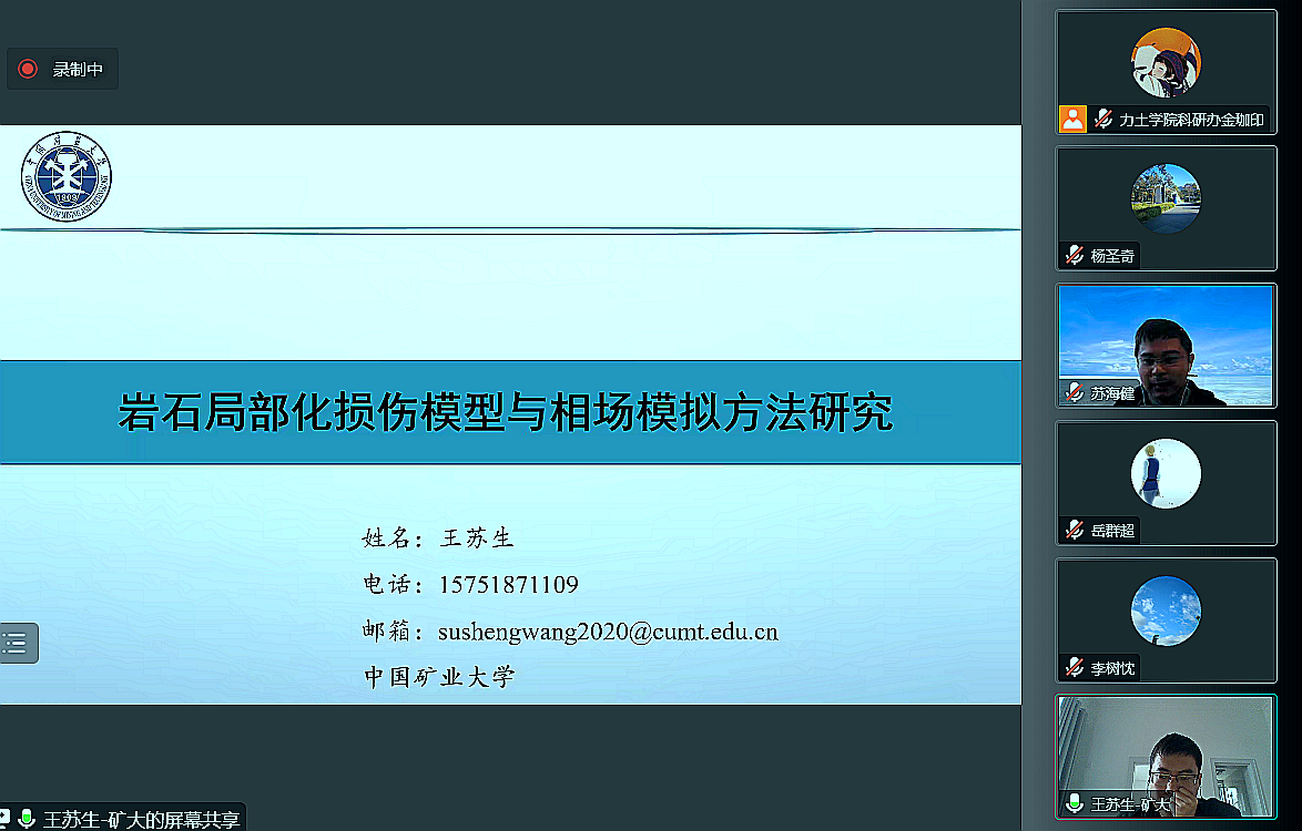 邀请岩石力学与工程研究所王苏生、田文岭老师王分别做了《岩石局部化损伤模型与相场模拟方法研究》、《花岗岩高温力学行为与损伤破裂机理研究》的学术报告。