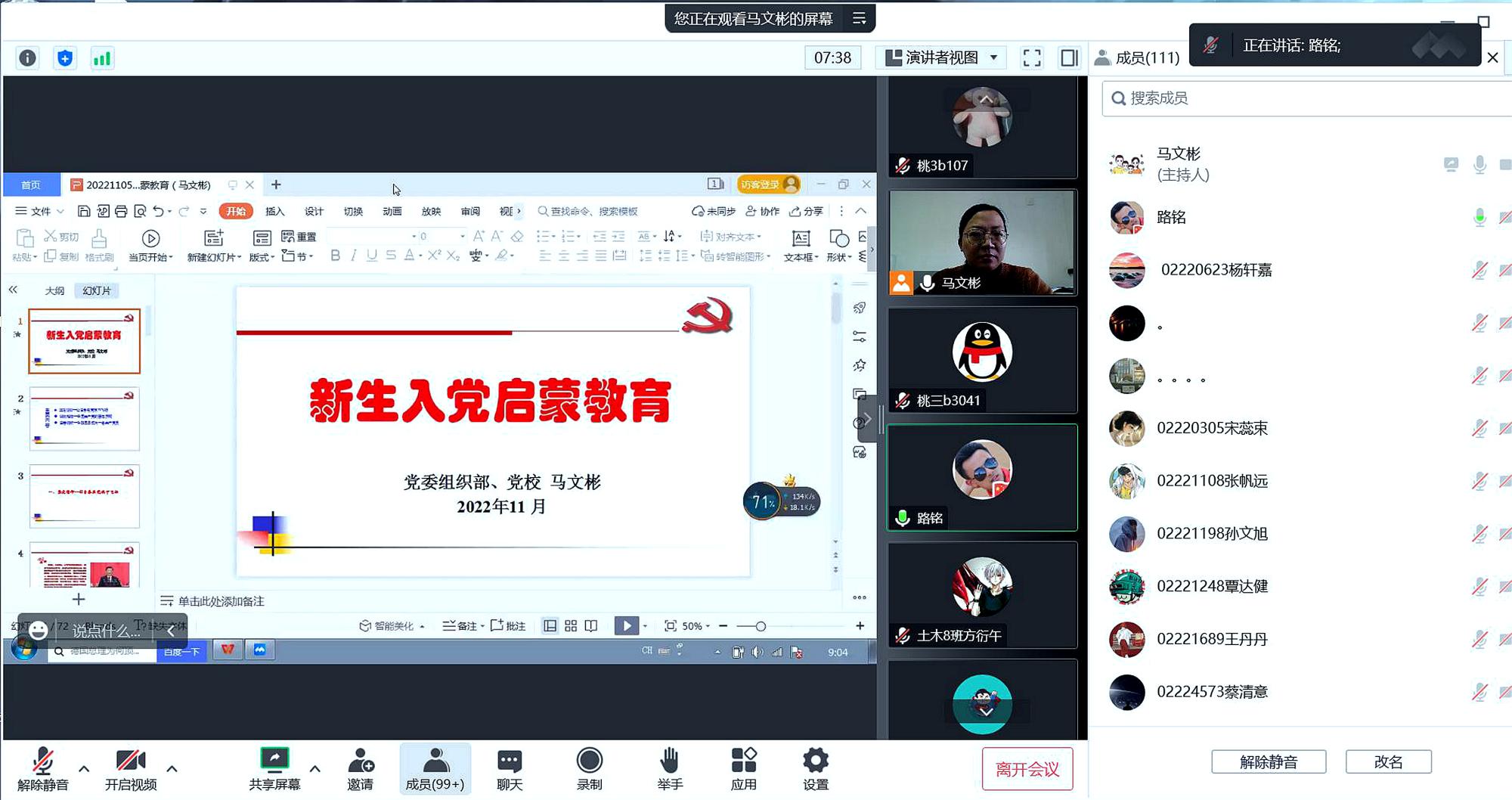 11月5日上午,学院邀请校党委组织部、党校马文彬老师在线上为2022级本科生进行入党启蒙教育,本次讲座由辅导员路铭老师主持,52av
