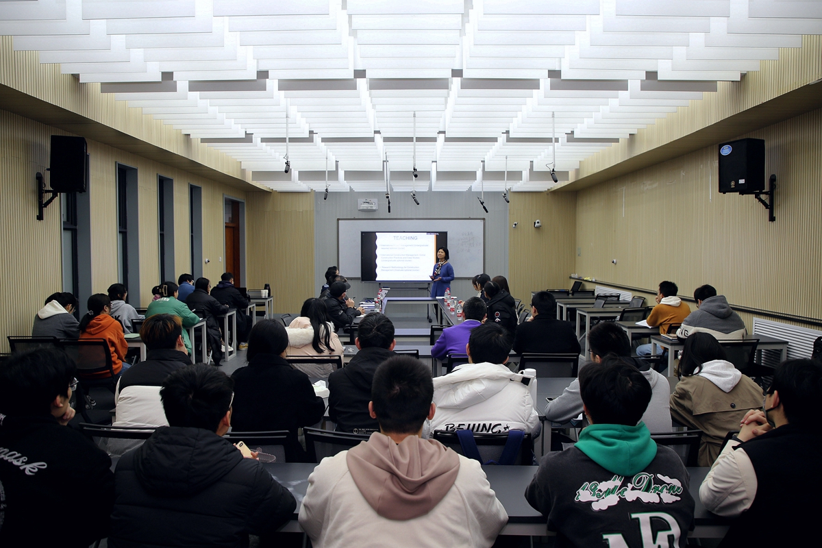 师生进行交流。学术报告交流会在学院楼B201举行。学院院长李树忱教授主持了会议。学院教授委员会主任、工程管理专业负责人王文顺教授,工管所所长乔亚宁、副所长倪国栋及石晓波、邹新、谷甜甜、牛苗苗等教师与研究生代表(含工程管理MEM)、本科生代表参加了本次会议。