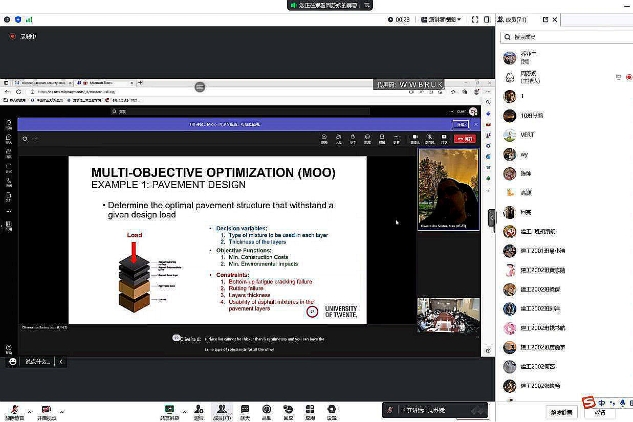 本次报告会特邀特温特大学的João Santos博士作了题为《Leveraging the sustainability of transportation infrastructure with multicriteria decision analysis methodologies》的学术报告。在报告中,Santos博士强调了在公路和铁路等基础设施项目中可持续发展的重要性,并分享了如何应用多标准决策分析方法来提高交通基础设施的可持续性。他重点介绍了多准则决策分析的理念及成本效益分析法、多目标规划法等多准则决策分析的方法,以综合考虑工程、财务、环境、社会等多种因素并做出最佳决策,以实现可持续未来的目标。