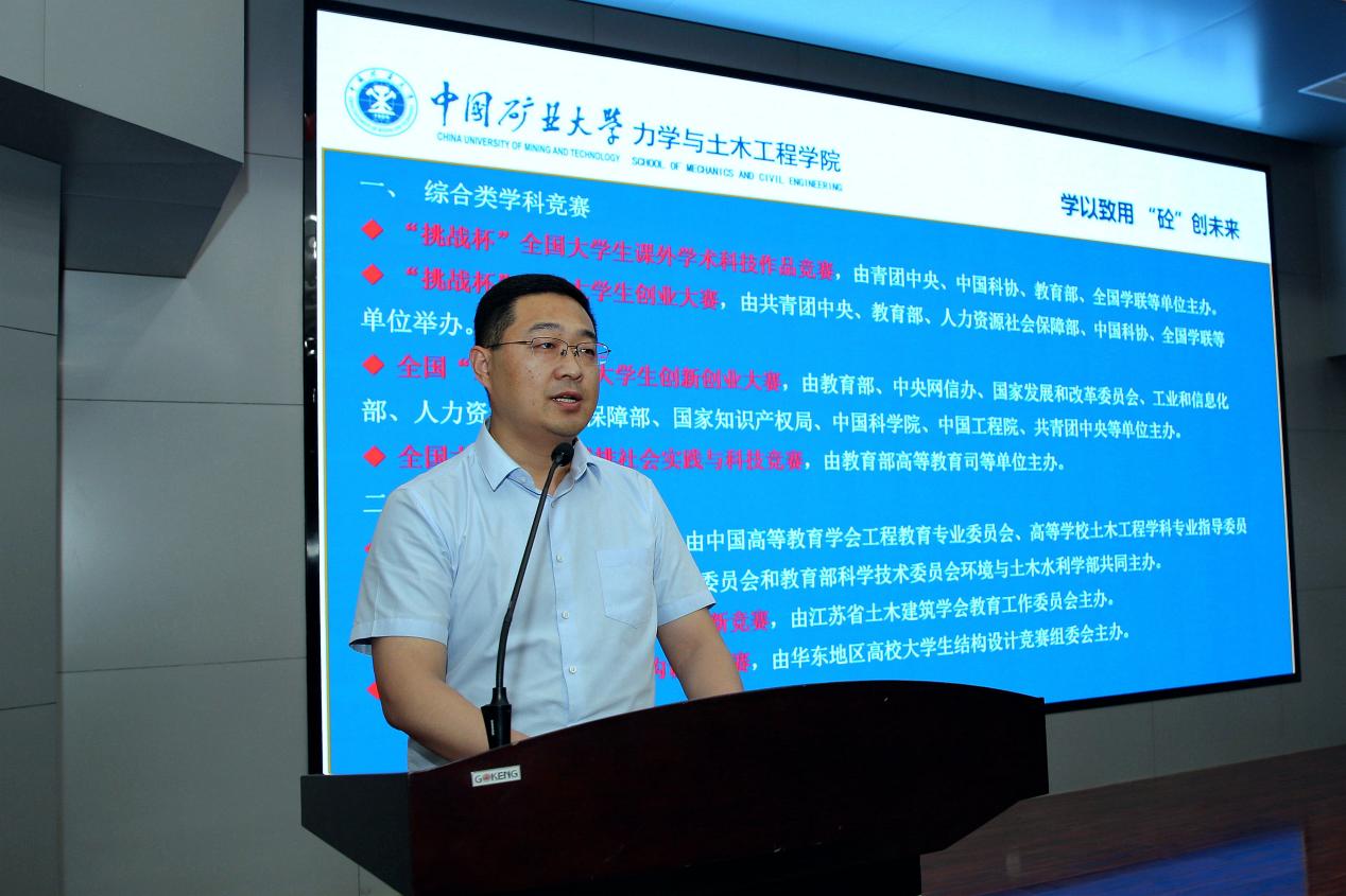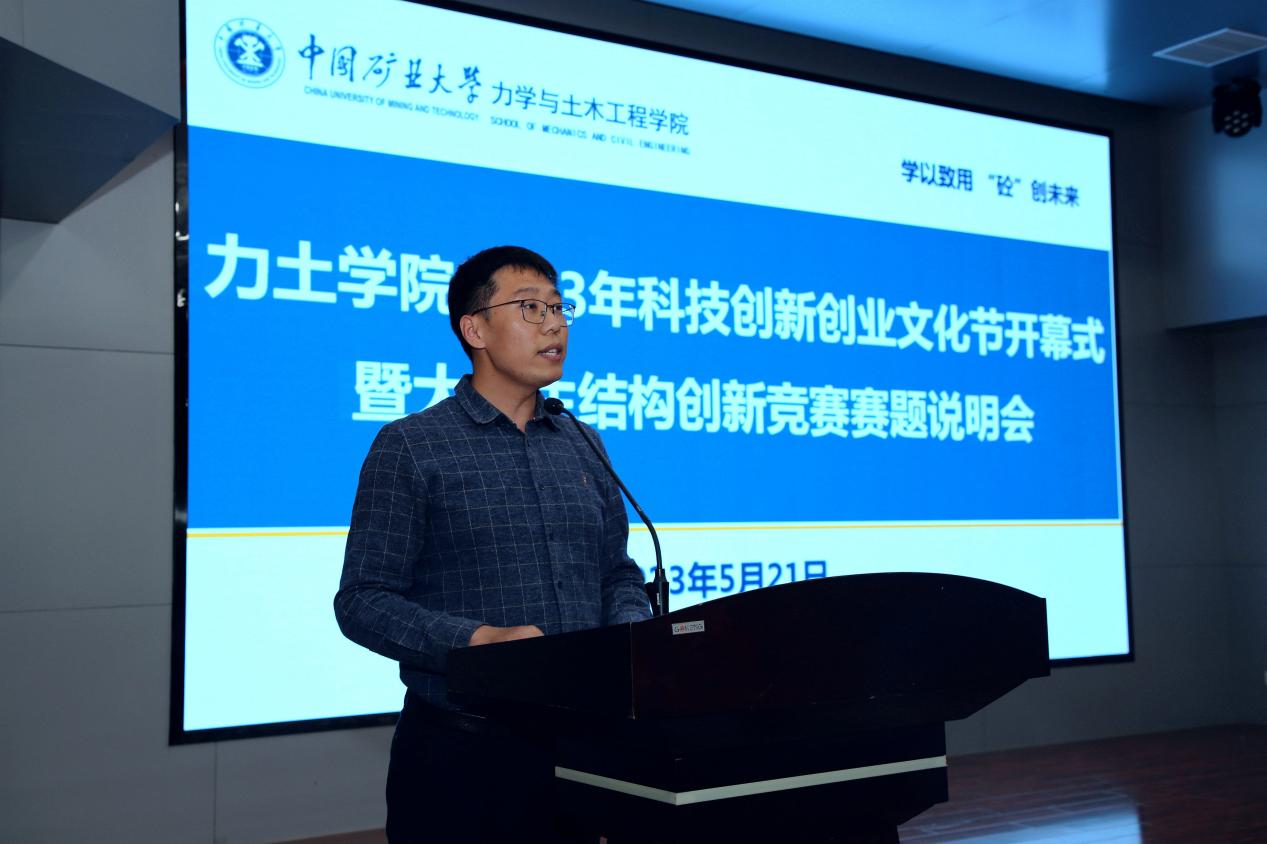学院党委书记马占国致辞。他首先介绍了本次科技创新创业文化节的背景、目的。他指出,学院历来高度重视大学生创新创业工作,通过构建“大创项目+科创竞赛+课程建设+服务保障”创新型人才培养体系、“3+N”大学生科创竞赛体系等着力提升大学生创新意识、创新能力,形成了良好的科创氛围,助力学院学子在众多学科竞赛、大学生创新创业训练项目中取得丰硕成果,接下来,学院将调整学生课外科技创新活动领导小组、学生学科竞赛指导委员会,加强指导教师队伍建设等,全力做好各项保障工作,推动学院创新创业工作取得新成果。他强调,本次大学生科技创新创业文化节以“学以致用 “砼”创未来”为主题,围绕学科专业性和趣味普及性两条活动主线开展,内容上包含讲座交流、专业学科竞赛、校园科创文化活动三个类别,是学院开展大学生创新创业教育的一个重要平台,对于不断增强同学们的创新精神和科研能力具有重要作用。他希望,学院师生广泛参与到科创文化节的各项活动中,实现教学相长;将本次科创文化节活动与学院学风建设工作紧密结合起来,以创促建以创促学;全院上下群策群力,建立引导同学们主动投身到科创活动的长效机制。