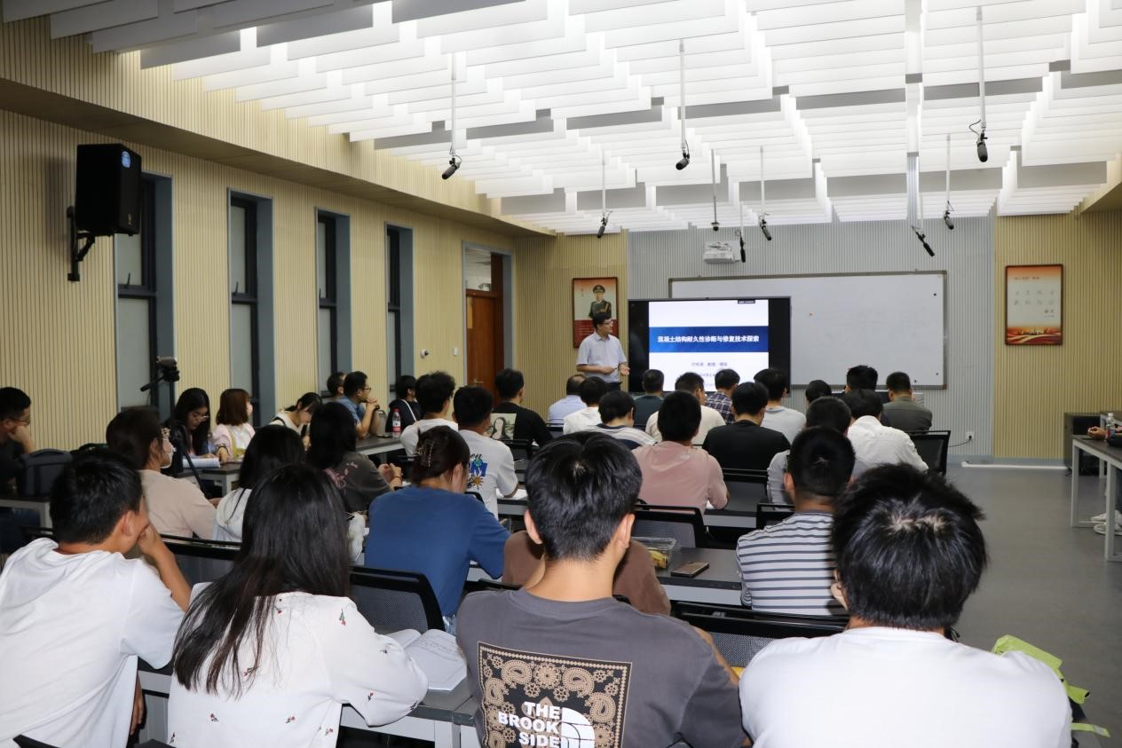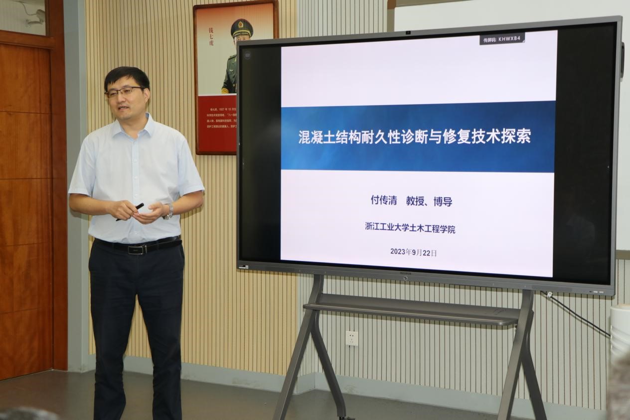 2023年09月22日下午,学院组织召开土木名家讲坛(2023年第十二期),特邀浙江工业大学健行特聘教授、浙江省杰青付传清教授作《混凝土结构耐久性诊断和修复技术探索》报告,学院副院长杨圣奇教授参会并主持会议,学院建工系老师姬永生教授、李富民教授、李贤教授等在内50余名师生参会交流。