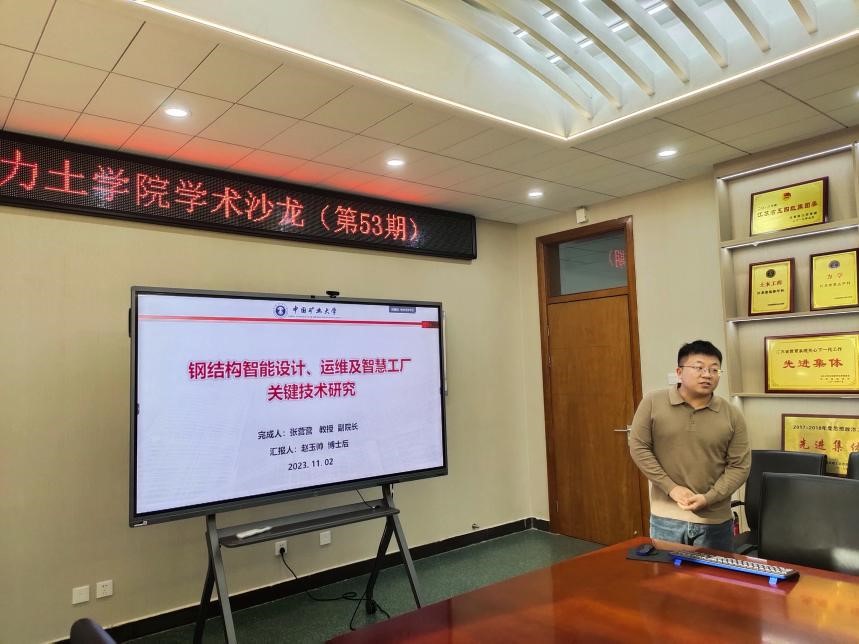 会上,夏军武教授、李贤教授、赵玉帅老师分别作了《全装配高性能建筑钢结构体系创新及墨尔本大学高访汇报》《波纹钢板组合结构研发》《钢结构智能建造、运维及智慧工厂关键技术研究》的学术报告,参会师生就相关学术问题和国外大学访学等方面分享交流。
