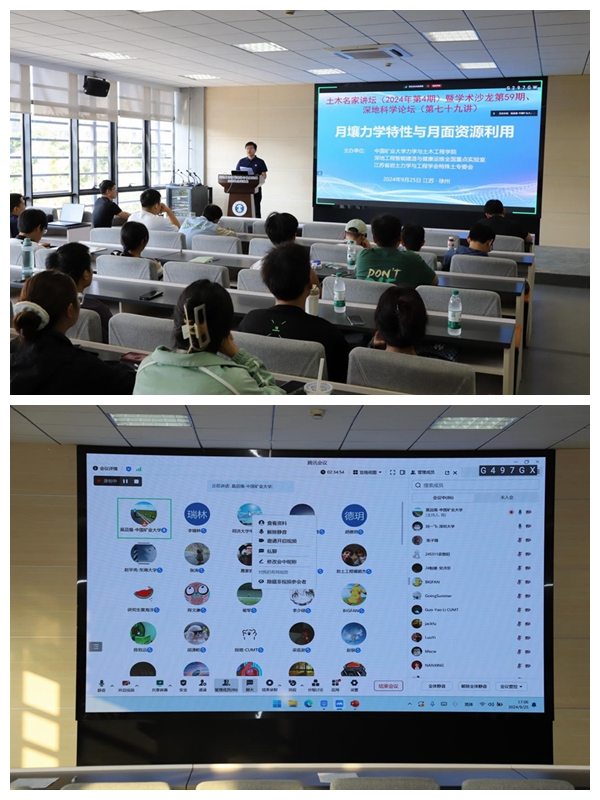 9月25日下午,学院土木名家讲坛(2024年第4期)暨学术沙龙(第59期)、深地科学论坛(第79讲)在深地国重305会议室举行,本次讲座的主题是“月壤力学特性与月面资源利用”,邀请东南大学赵学亮、武汉大学聂家岩、深圳大学刘一飞、成都理工大学李谦以及本校土力所朱启银、李瑞林两位副研究员,共6位青年学者参会作学术报告,线上线下师生参会共计100余人。