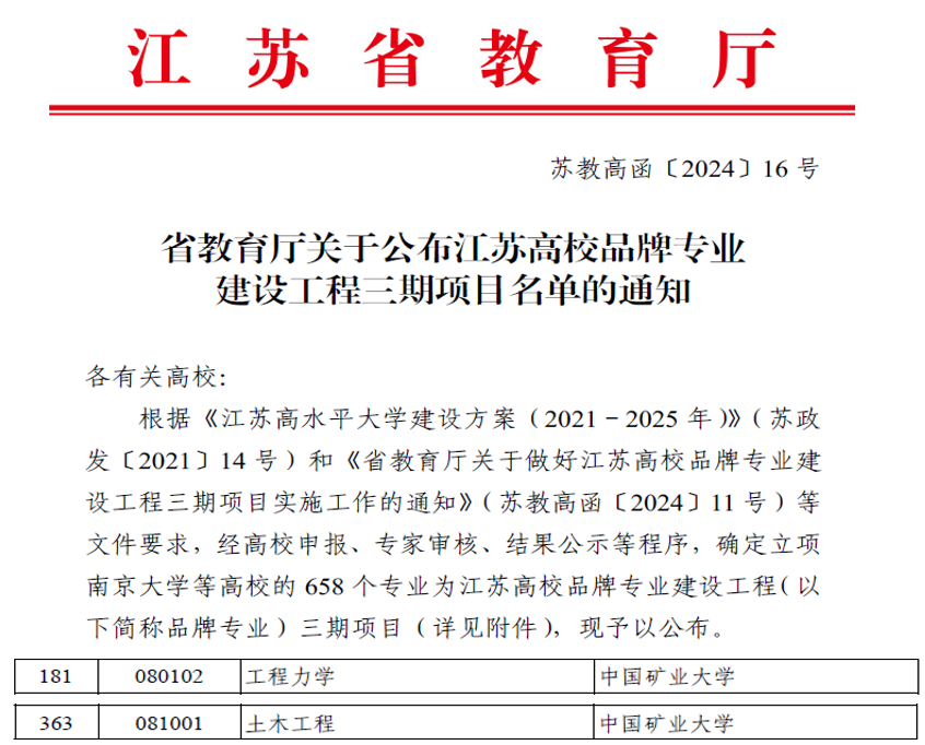 日前,江苏省教育厅印发《省教育厅关于公布江苏高校品牌专业建设工程三期项目名单的通知》(苏教高函〔2024〕16号),学院土木工程专业作为“双一流”和优势学科支撑专业,工程力学专业作为基础学科拔尖学生培养计划专业获批江苏高校品牌专业建设工程三期项目。