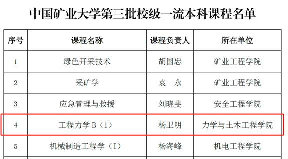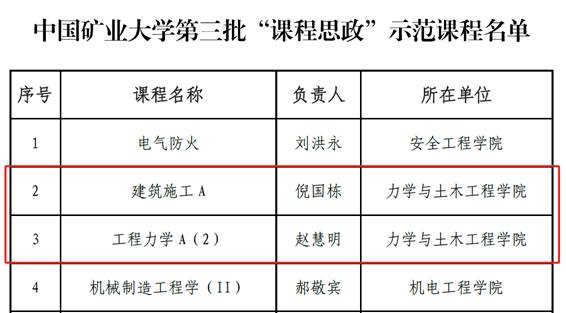 第三批校级一流课程认定结果的通知》(中矿大教字〔2024〕18号),学院2门课程被认定为校级“课程思政”示范课程,1门课程被认定为校级一流本科课程,具体名单如下: