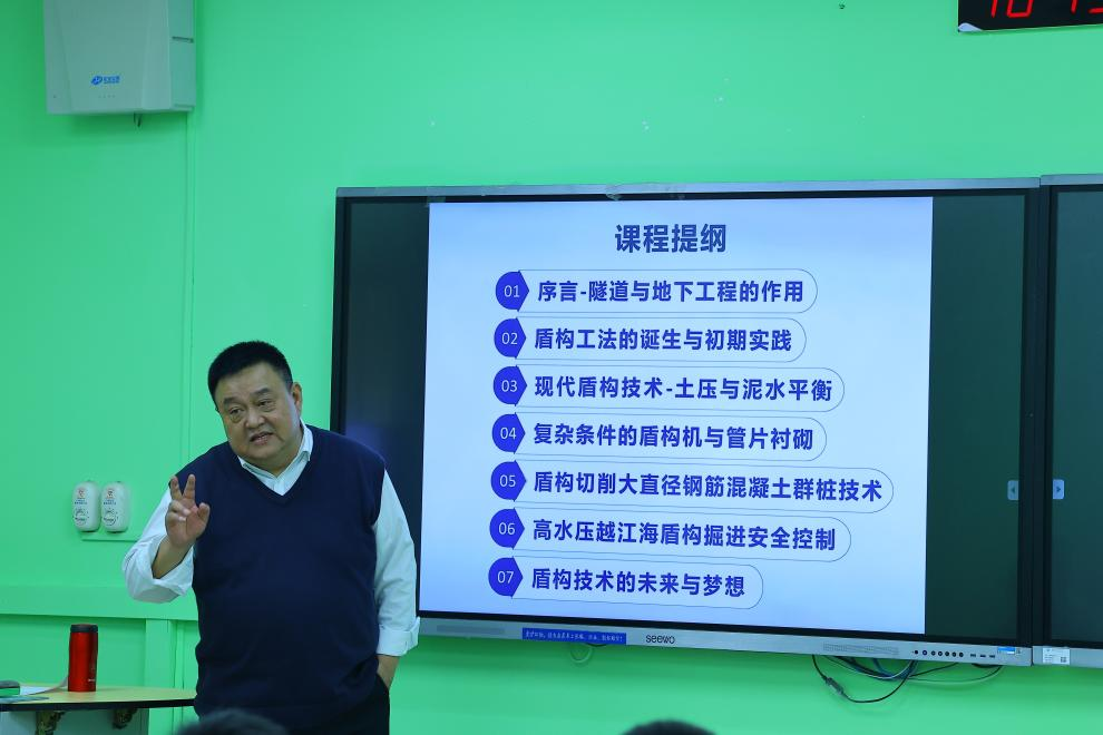 11月13日,学院“学术前沿,启迪人生——专家学者进课堂”系列讲座开讲。我国盾构领域知名专家袁大军教授走进2021级岩土与矿山工程专业本科生班,并作题为“盾构隧道科学技术的创新发展与工程实践”的学科前沿讲座。讲座由学院岩力所教师万泽恩主持。