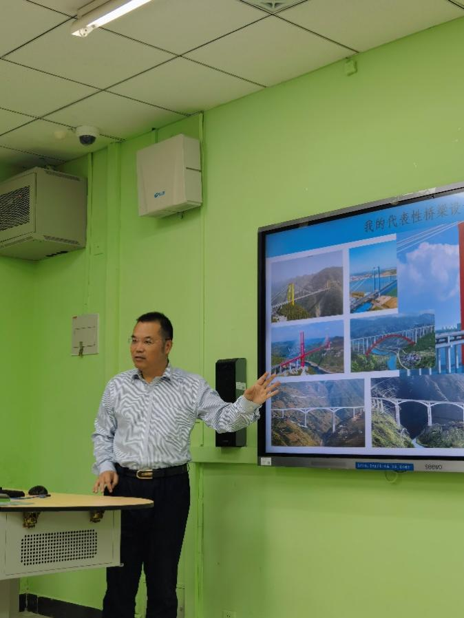 彭元诚教授从桥梁技术的发展、桥梁结构分类等方面进行讲解。他讲述了我国近年来桥梁技术的进步以及取得的巨大成就,用代表性的工程解释了悬索桥、斜拉桥、连续空腹钢构桥等桥型的特点与区别。他表示,大跨度桥梁是连接地理空间的纽带,特别是对于云贵川等地形复杂地区交通出行具有重大作用,勉励同学们从事相关领域的工作。
