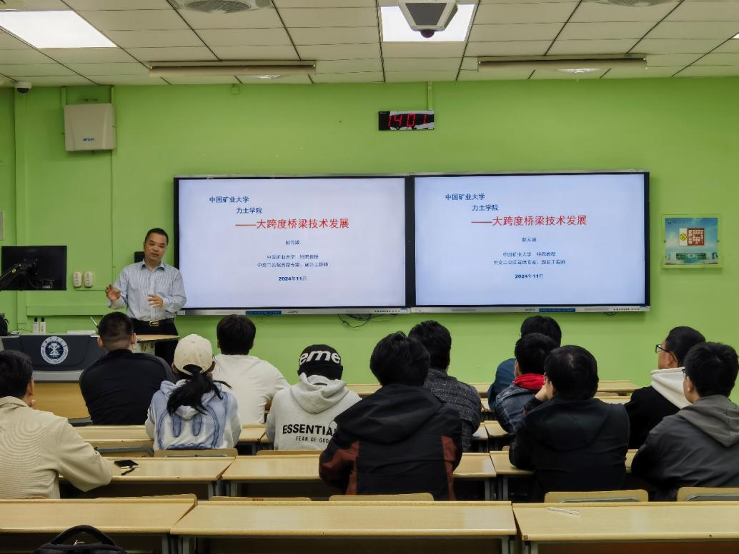11月15日,“学术前沿,启迪人生——专家学者进课堂”系列讲座的第二讲开讲。我国桥梁领域知名专家彭元诚教授走进2021级岩土与矿山工程专业本科生班,并作题为“大跨度桥梁技术发展”的学科前沿讲座。