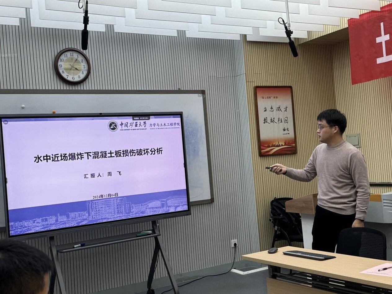 随后,周飞老师以《水中近场爆炸下混凝土板损伤破坏分析》为题进行了精彩的学术报告。他结合自己的研究领域,详细阐述了水中近场爆炸对混凝土板造成的损伤破坏机制,并展示了相关的实验数据和模拟结果。周飞老师的报告内容丰富、深入浅出,引起了与会者的广泛关注和热烈讨论。