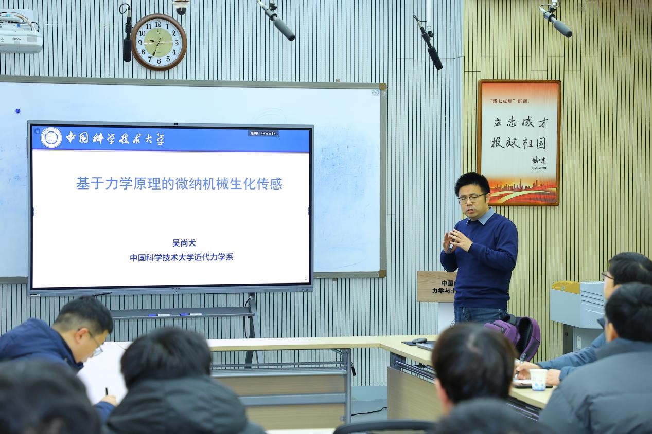 吴尚犬教授以其深厚的学术功底和前沿的研究视角,为与会师生呈现了一场题为《基于力学原理的微纳机械生化传感》的精彩学术报告。报告中,吴教授详细阐述了微纳机械生化传感技术的基本原理、最新进展及其在生物医学、环境监测等领域的广泛应用前景。他通过生动的案例和详实的数据,展示了力学原理在微纳尺度生化传感中的独特优势和创新应用。