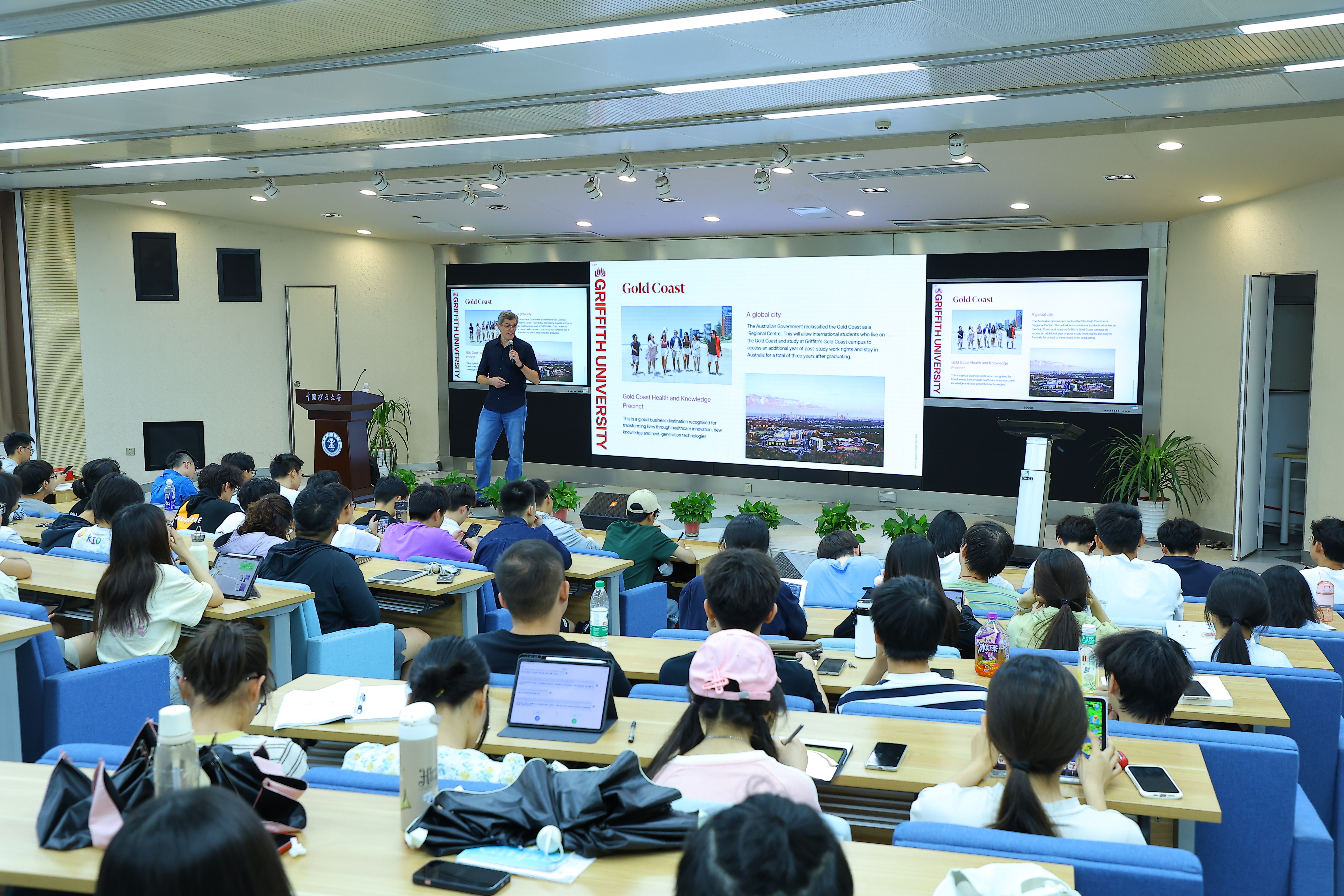 宣讲会上,Andrew副教授概述了澳大利亚独特的社会文化风貌及其优质教育体系。他聚焦格里菲斯大学,重点介绍了该校在工程与建筑环境领域的强劲实力、鲜明的学科特色,丰富的学习资源、实践平台和高度国际化的学习环境。他详细解读了格里菲斯大学吸引国际学生的各项优势,包括创新的课程设置、紧密的产学研结合、优越的地理位置以及多元包容的校园文化,为有意赴澳深造的同学们描绘了清晰的发展蓝图。