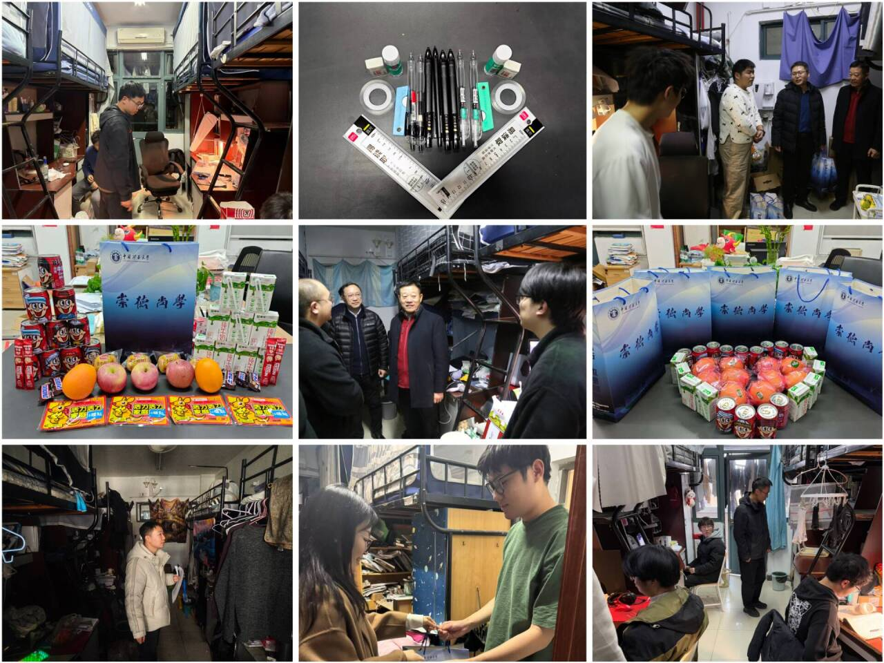12月11日21:30学院领导老师走进宿舍落实一线规则,为正在紧张备考的考研学子举办了一场温馨的慰问活动,向同学们发放精心准备的“暖心礼包”。学院党委书记马占国、党委副书记纪承、毕业班辅导员朱宁、张琳和班主任梁明、赵石强、殷鹏飞、朱玉晓、褚召祥、郁林利等老师共同参与了此次活动,在寒冬夜晚为学子们送上了温暖的关怀与诚挚的祝福。