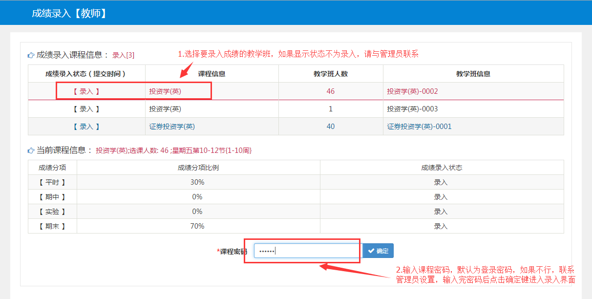 进入界面后,选择可录入的教学班,输入课程密码(请联系学院教务科查询),如下图: