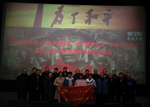 本次活动是建筑工程系教工党支部为深入贯彻落实习近平总书记在纪念中国人民志愿军抗美援朝出国作战70周年大会上的重要讲话精神,巩固深化“不忘初心、牢记使命”主题教育成果,同时深入贯彻习近平总书记关于统筹抓好疫情防控和经济社会发展工作的重要指示精神,贯彻落实在疫情防控常态化条件下满足我系广大老师的精神文化需求而开展。本次活动也是对全系老师开展的一次铭记历史、捍卫和平的爱国主义教育活动,同时也是建筑工程系教工党支部系列主题党日活动之一。