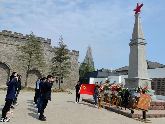 在运河支队抗日烈士纪念碑前,全体党员庄严肃立,党支部委员会向烈士们敬献花篮,举行了悼念仪式。党支部书记孟波带领全体党员庄严宣誓,重温入党誓词,再次表达作为共产党员的决心和信念。